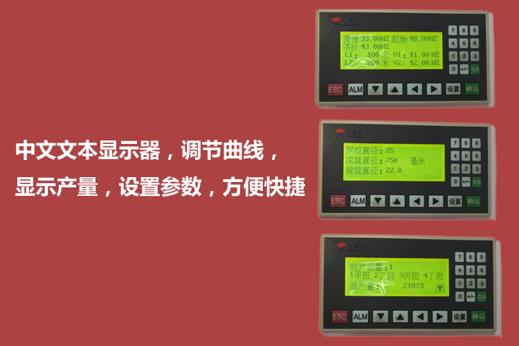 1、16段紡紗曲線設(shè)定。用戶可根據(jù)工藝來設(shè)定紡紗過程中每個(gè)階段的長度和速度,這樣就能夠讓細(xì)紗機(jī)在小紗、中紗、大紗的不同階段使用不同的速度來生產(chǎn),即在小紗和大紗階段適當(dāng)降速,改善毛羽,減少斷頭(同時(shí)斷頭少也減少了值車工接頭量,節(jié)省人工),以提高質(zhì)量;在中紗階段提速,以提高產(chǎn)量(可提高8%-10%的產(chǎn)量)。